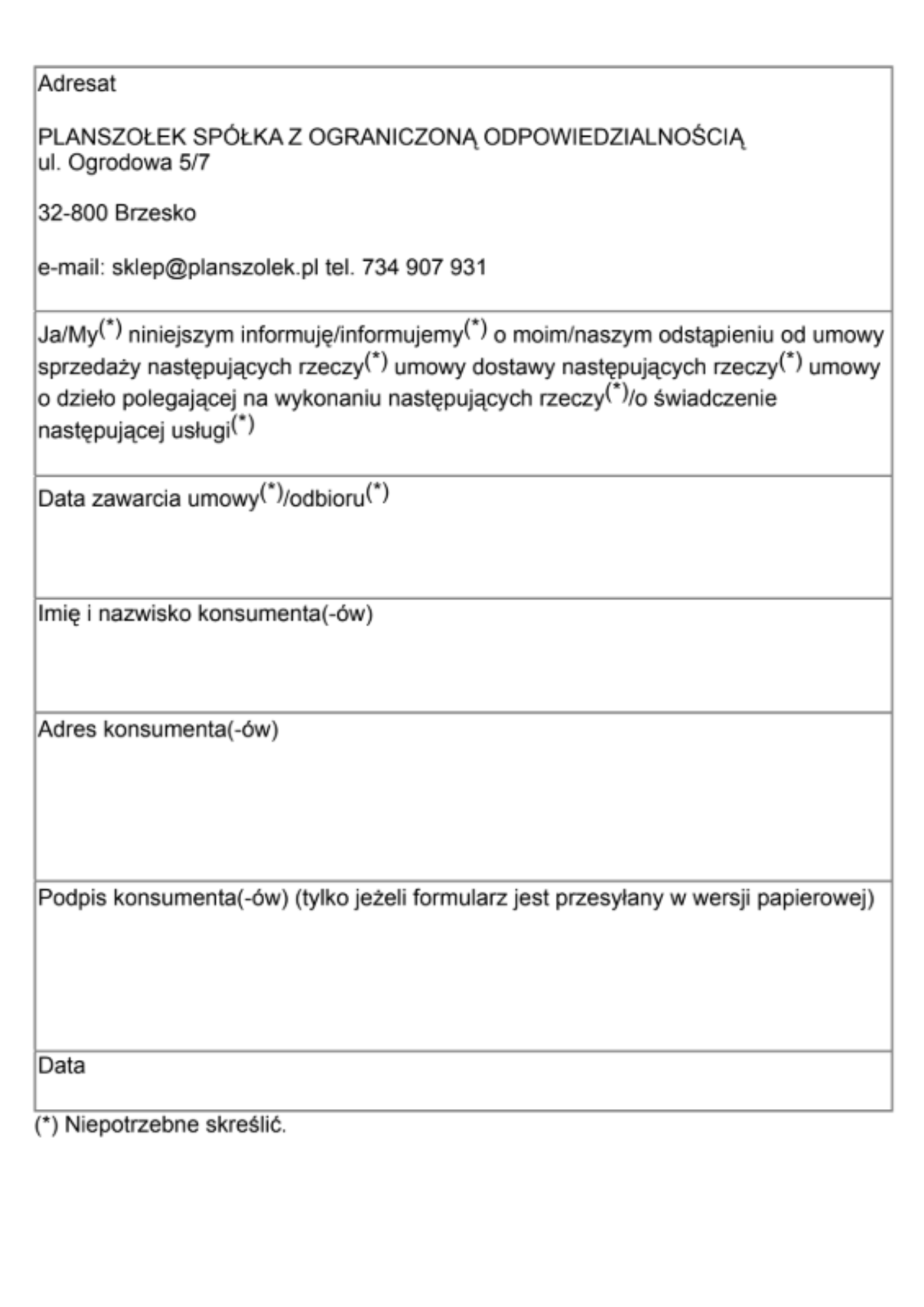 rozdziale 14 niniejszego Regulaminu lub przesyłając wiadomość e-mail na adres: sklep@planszolek.pl.