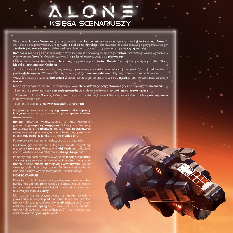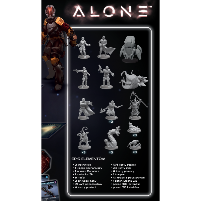 Alone to asymetryczna gra o przetrwaniu, dedukcji i blefie dla 2–4 graczy, w której jeden Bohater eksploruje mroczne korytarze opuszczonej stacji, a pozostali gracze kierują siłami zła. Dynamiczna rozgrywka pełna napięcia i taktycznych wyborów tworzy intensywną atmosferę sci-fi survivalu.