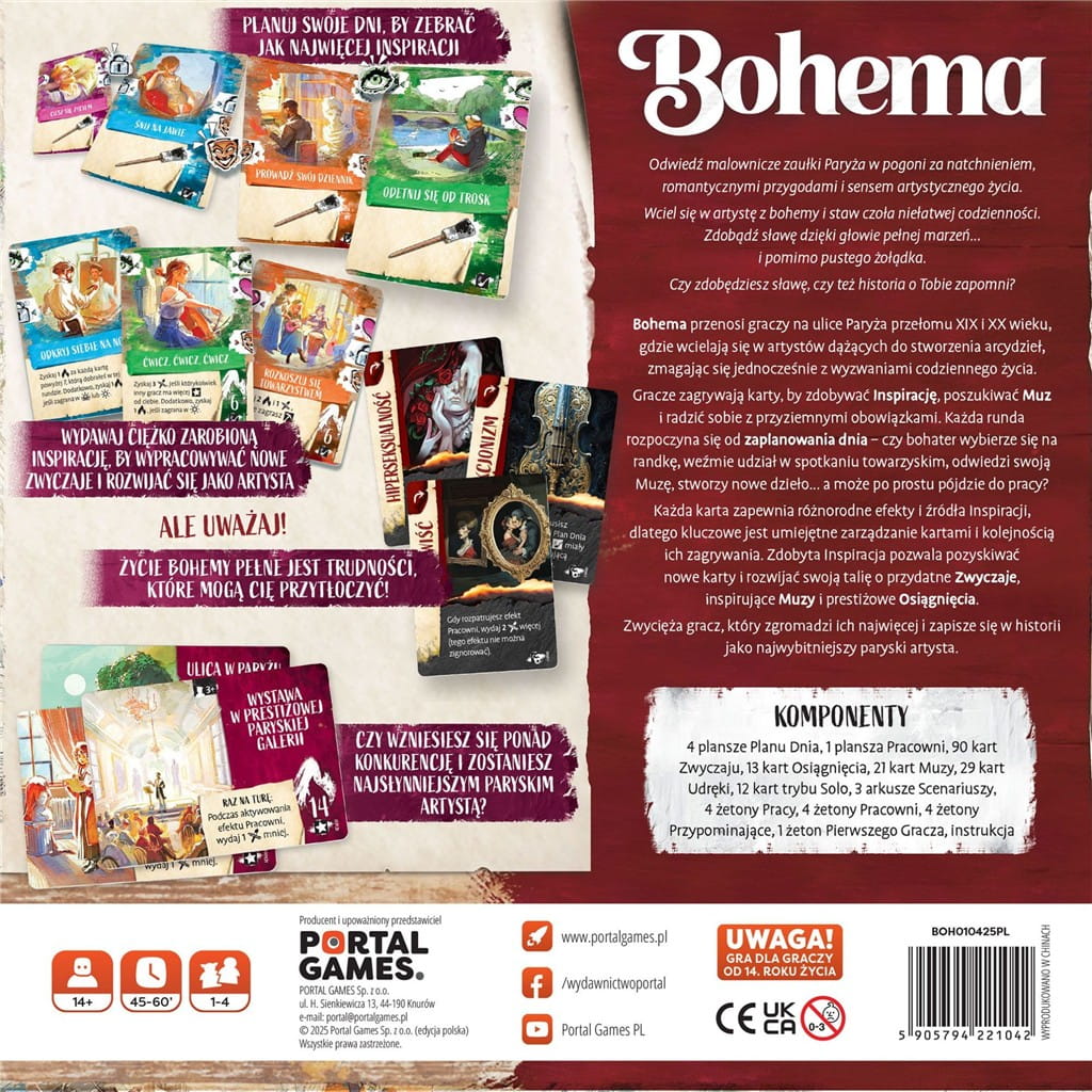 Bohema to karciana gra budowania talii, w której stajesz się artystą w Paryżu przełomu XIX i XX wieku. Decydujesz, czy poświęcasz dzień pracy zarobkowej, randce, spotkaniu z muzą czy twórczemu szałowi, by zdobyć uznanie i inspirację. Idealna dla graczy 1-4 osób, którzy chcą poczuć klimat bohemy artystycznej.