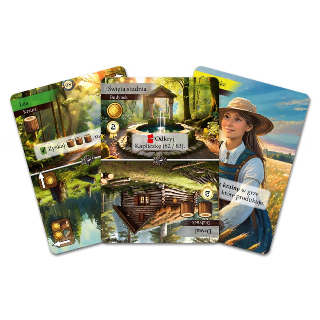 • karty reprezentujące różne części królestwa (np. lasy, góry, łąki), budynki, mieszkańców i wydarzenia,