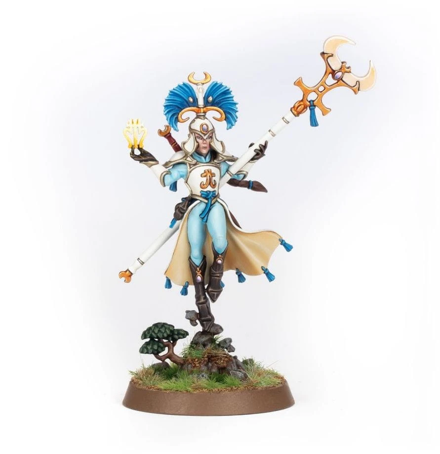 Scinari Enlightener to potężny mag Lumineth, specjalizujący się w magii światła i odbijaniu ataków przeciwnika. Zestaw zawiera model z opcjami personalizacji głowy.