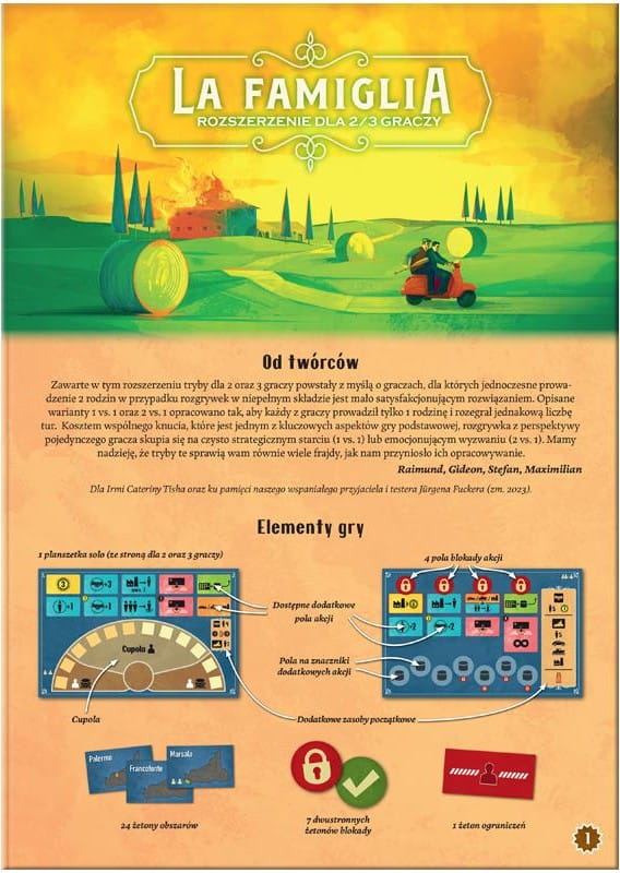 La Famiglia: Wielka Wojna Mafii – Rozszerzenie dla 2/3 graczy to dodatek do wysoko ocenianej strategicznej gry planszowej La Famiglia, który umożliwia rozgrywkę w mniejszym składzie – dla dwóch lub trzech graczy – bez utraty napięcia i głębi decyzji znanych z gry podstawowej.