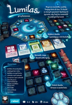 Lumilas to rodzinna gra logiczna, w której gracze budują własne lasy, układając kafelki i zapraszając do nich tajemnicze duszki. W każdej turze wybierasz jedną z dostępnych istot i decydujesz, w jaki sposób wkomponować ją w swoją planszę. Tworzysz określone układy z kafelków drzew, starając się jak najlepiej dopasować je do wymagań duszków oraz dostępnych celów punktowania.