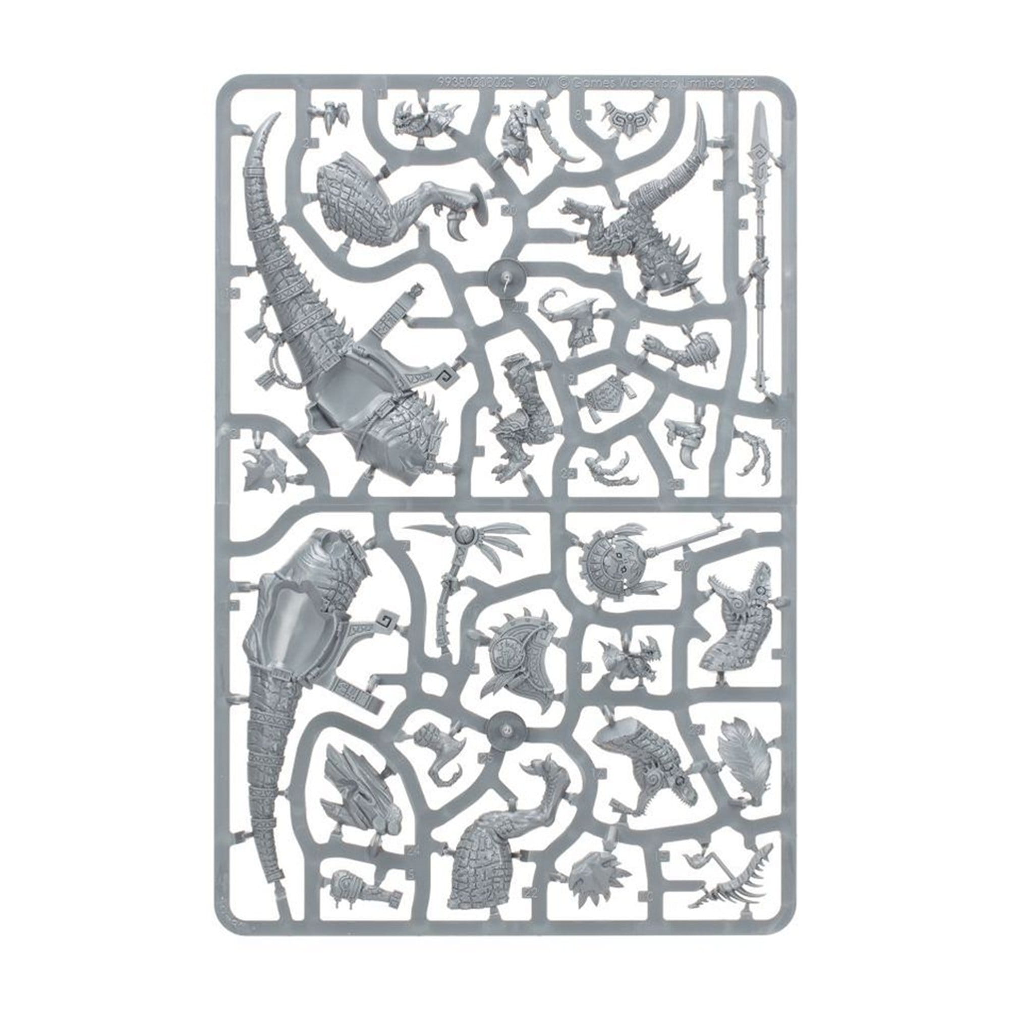 Zestaw pozwala zbudować model z reliktową celestytową włócznią lub maczugą i oferuje 3 opcje głowy: pierzastą maskę wojenną, agresywny warkot albo potężny ryk — dzięki czemu możesz dopasować model do stylu swojej armii. Aggradon i jeździec są przyozdobieni bogatą zbroją i symboliką Seraphon, a siodło zdobi ikona Itzla Poskramiacza, co podkreśla status weterana.