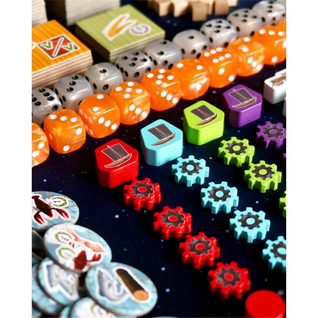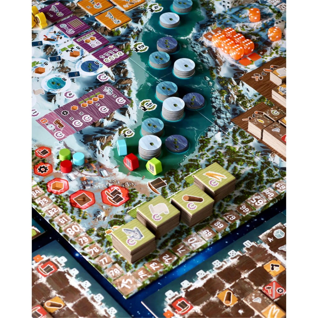 Mechanika Saltfjord opiera się na drafcie kości, które aktywują budynki na Twojej planszetce. Każda runda wymusza analizę dostępnych wyników i dobranie optymalnego zestawu działań: od wypraw rybackich, przez rozbudowę osady, aż po handel i rozwój technologiczny. Rozwijając swoją wioskę, zwiększasz liczbę akcji możliwych do wykonania, co w naturalny sposób buduje Twoją ekonomię i pozwala tworzyć silne kombinacje.