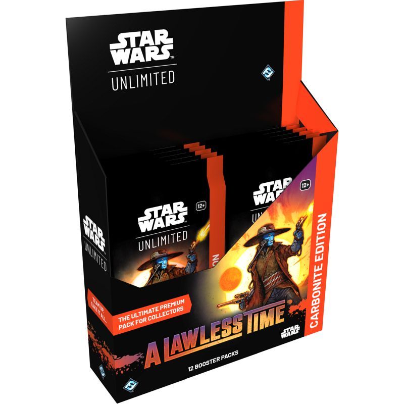 Star Wars: Unlimited – A Lawless Time Carbonite Booster Display to zestaw zawierający 12 Carbonite Boosterów do gry Star Wars: Unlimited. Każdy booster oferuje 16 losowych kart, w tym wyjątkowe warianty kolekcjonerskie oraz jedną ekskluzywną kartę Prestige, dostępną wyłącznie w tym typie paczek.