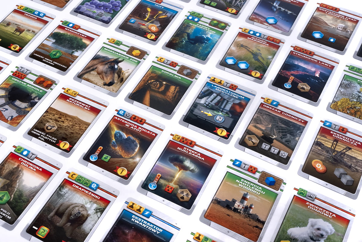 W pudełku znajdziesz: zestaw kości zasobów, plansze korporacji, karty projektów, planszę globalnych parametrów, żetony i instrukcję.